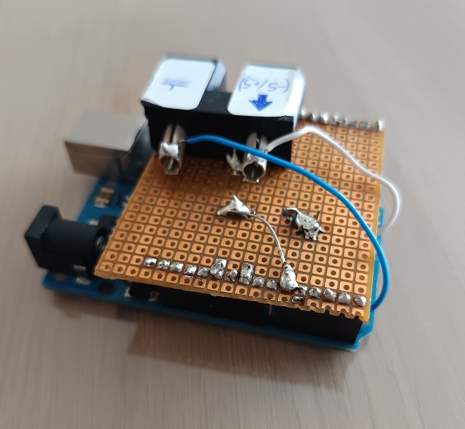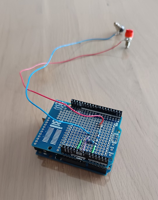 Le montage étant destiné à être utilisé avec des élèves, une breadboard n'est pas envisageable, et il faut utiliser un shield où les composants seront soudés. Afin d'avoir une précision maximale, il faut utiliser des résistances de précisions (1%).