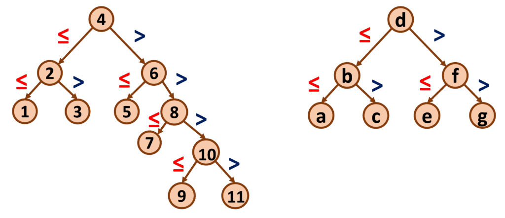 Deux exemples d’ABR, un avec des nombres entiers (à gauche) et l’autre avec des chaînes de caractères (à droite) :