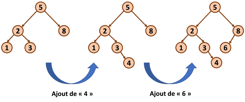 Le premier ajout (4) se fera obligatoirement dans le SAG du nœud racine « 5 », car 4 ≤ 5. Ce SAG a comme nœud racine « 2 ». Comme 4 > 2, l’ajout doit se faire dans le SAD du nœud « 2 ». Ce SAD a comme nœud racine « 3 ». Comme 4 > 3, l’ajout doit se faire dans le SAD du nœud « 3 ». Comme ce SAD est vide, on le remplace par un nœud contenant « 4 ». Le même raisonnement permet de comprendre le positionnement de l’élément « 6 » : comme 6 > 5, donc il faut l’insérer à droite de « 5 », et comme 6 ≤ 8, il faut l’insérer à gauche de « 8 ». Quelques pistes :