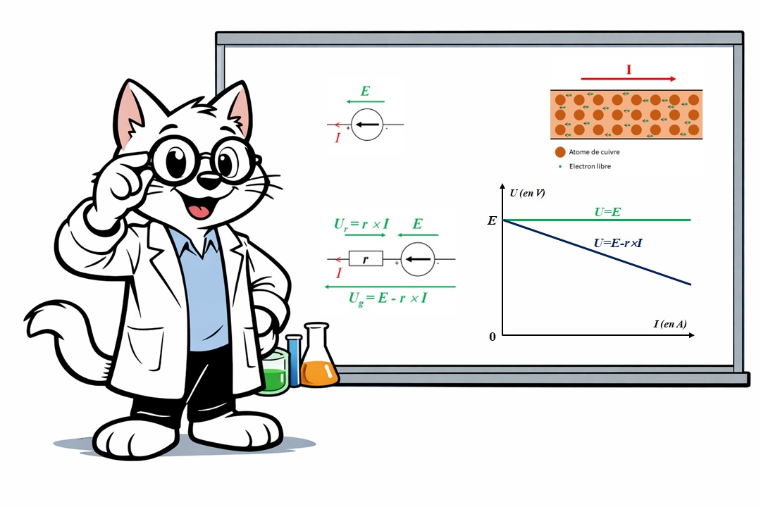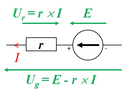 Où : ​\( U_{g} \)​​ est la tension aux bornes du générateur réel de tension (en V), \( E \)​​ est la f.é.m du générateur idéal de tension (en V), \( r \)​ est la résistance interne du générateur (en Ω), ​ et ​\( I \)​ l'intensité du courant qui le traverse (en A).