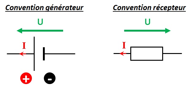 Dans un schéma, quand on représente un générateur, on oriente dans le même sens la tension à ses bornes et le courant qui le traverse : il s'agit de la convention générateur. Quand on représente un récepteur, on oriente en sens inverse la tension à ses bornes et le courant qui le traverse : c'est la convention récepteur :