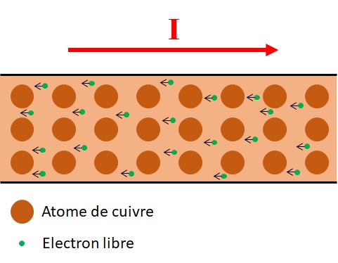Sachant que la charge d'un électron est, en valeur absolue, égale à ​\( e \)​, le nombre d'électrons qui circule dans une section du fil pendant une seconde est égal à : ​\( N_{e^{-}}=\frac{Q}{e} \)​ = 6,25 × 1018 pour une intensité de 1 A !