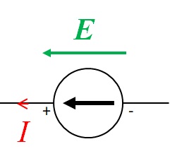 Un générateur idéal de tension est un dipôle qui a une tension constante à ses bornes. Cette tension ne dépend pas, notamment, de l'intensité du courant fourni par ce générateur. Cette tension est appelée force électromotrice (ou f.é.m.) du générateur, et on la note ​\( E \)​. On représente un générateur de tension idéal de la façon suivante :