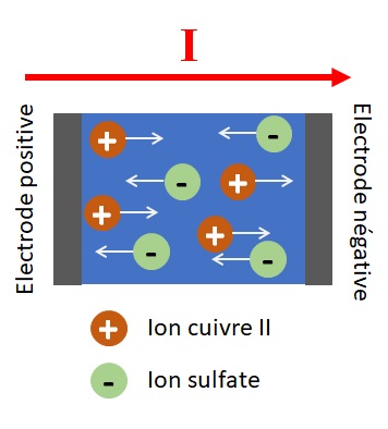 Dans une solution ionique, comme une solution de sulfate de cuivre, par exemple, le courant électrique est dû au déplacement des ions : les cations, positifs, se déplacent dans le sens conventionnel, de la borne positive à la borne négative, et les anions, négatifs, se déplacent dans le sens inverse du sens conventionnel, de la borne négative à la borne positive :