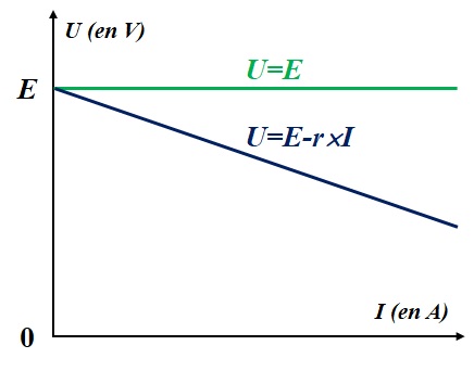 En réalité, la tension aux bornes d'un générateur réel diminue quand la valeur de l'intensité fournie augmente.