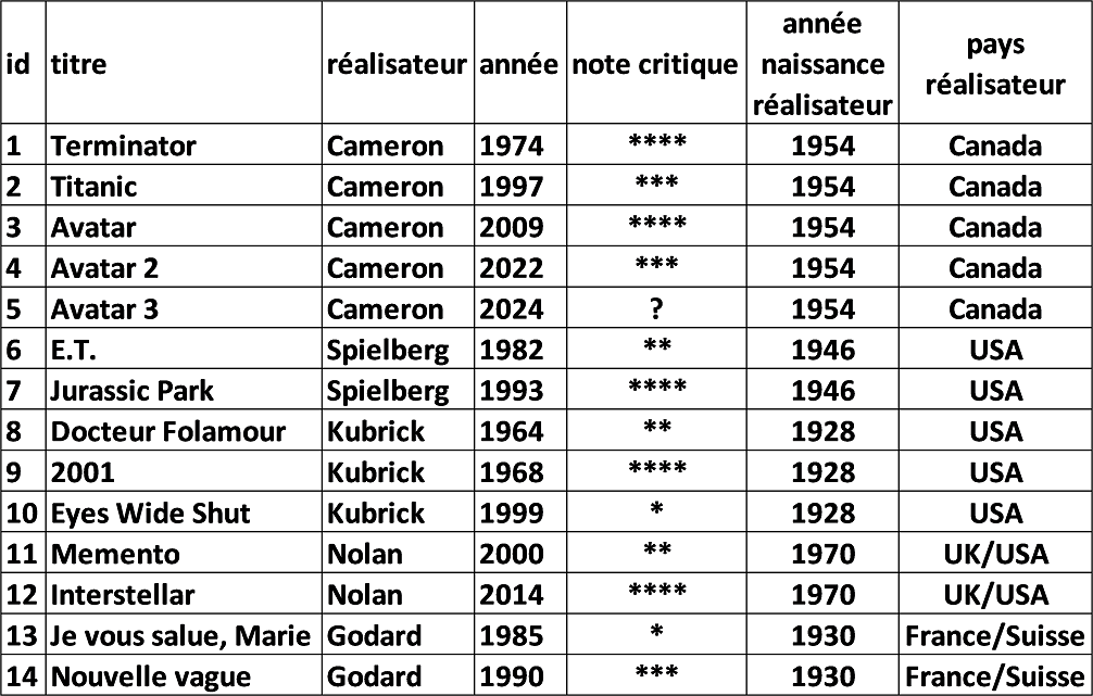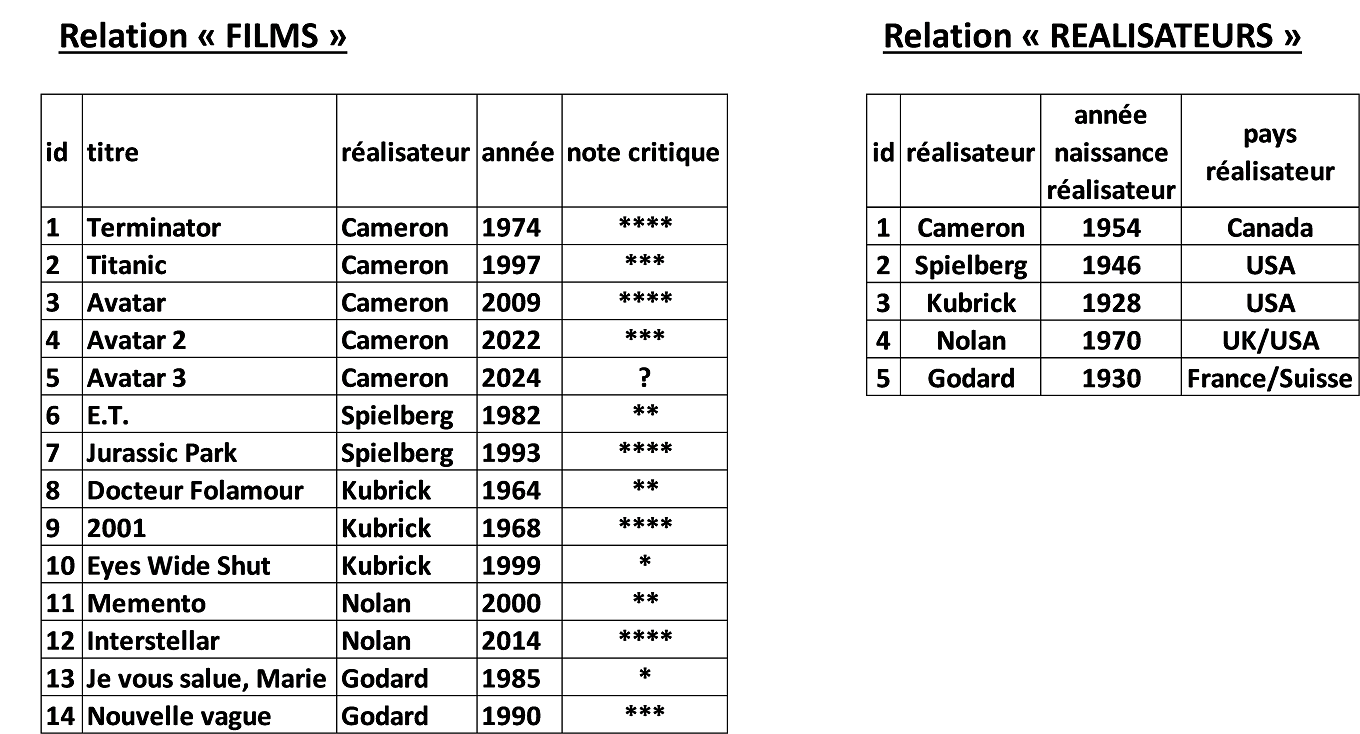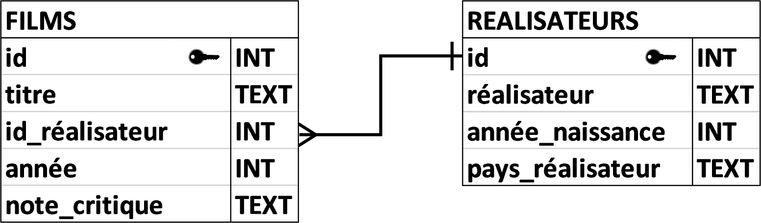 FILMS(id : INT, titre : TEXT, #id_réalisateur : INT, année : INT, note_critique : TEXT)