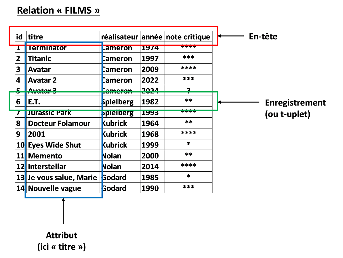 Dans notre exemple, le premier attribut « id », correspond au numéro du film. Il s’agit donc d’un nombre entier (noté INT). De même pour le quatrième attribut « année ». Les deuxième, troisième et cinquième attributs, « titre », « réalisateur » et « note critique » sont des chaînes de caractères (notées TEXT).
