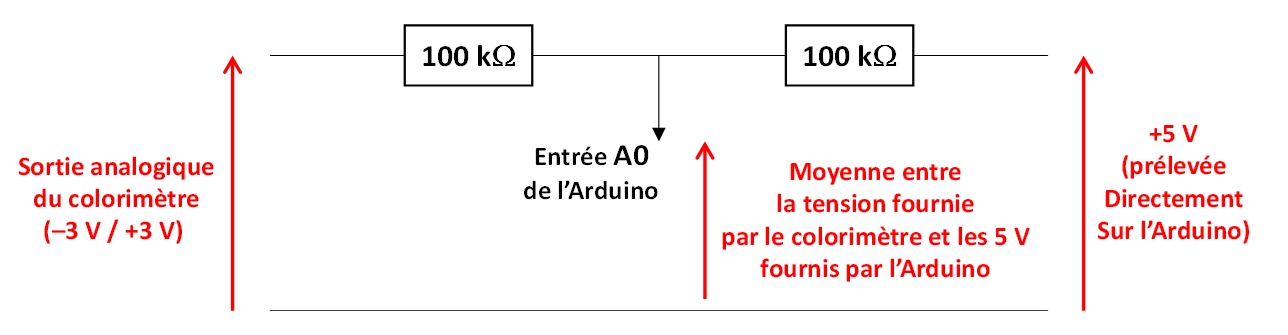 La documentation du colorimètre nous dit que la tension aux bornes des sorties analogiques varie de –3 V à +3 V en mode absorbance (et est égale numériquement à la valeur de l’absorbance) et de 0 à 1 V en mode transmittance (et est égale numériquement à la valeur de la transmittance divisée par 100). Les entrées analogiques de l’Arduino ne peuvent recevoir qu’une tension positive, comprise entre 0 et 5 V. Il est donc nécessaire d’adapter la tension, grâce au montage suivant (présent dans l’adaptateur Arduino) :