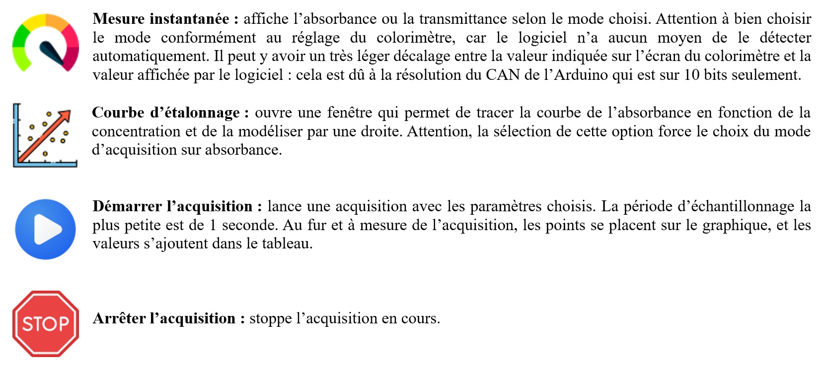 En mode absorbance, la tension fournie par le colorimètre (–3 V à + 3 V) est convertie en une tension comprise entre 1 V et 4 V. L’amplitude de tension est donc divisée par 2. Sachant que le CAN de l’Arduino comporte 10 bits, il y a donc 210 valeurs possibles pour 5 V. Pour les 3 V correspondants à l’amplitude de mesure en mode absorbance, on a donc : 210 × 3 / 5 ≈ 615 valeurs. Soit une précision d’environ 5 mv, soit 0,01 unités d’absorbance.