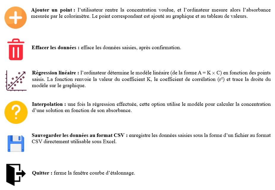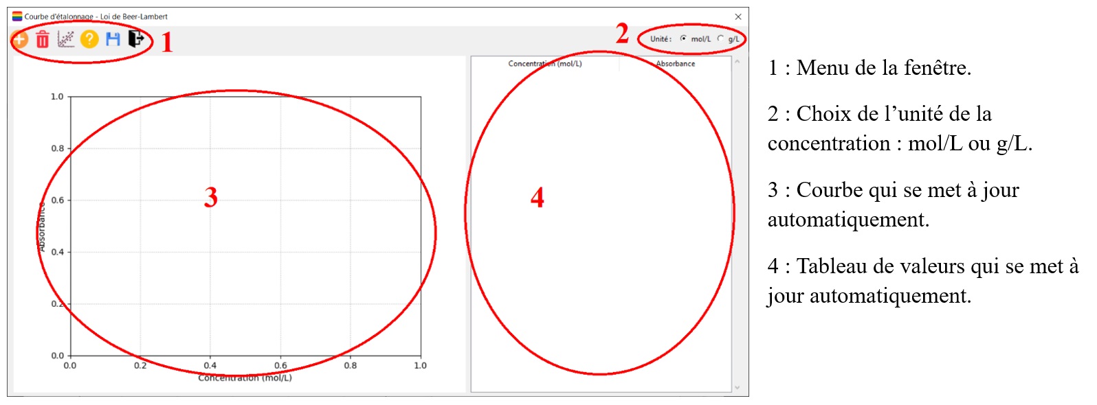 Fenêtre Courbe d’étalonnage – Loi de Beer-Lambert :