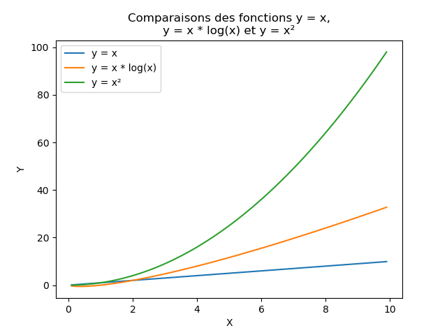 • Pour comparaison, voici les fonctions y=x (linéaire), y=x×log(x) (linéarithmique) et y=x2 (quadratique ou carrée) :