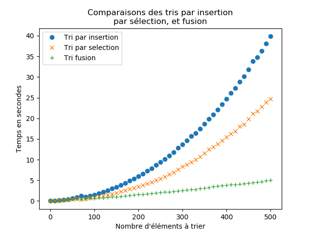 Note : comme le tri de 500 éléments est extrêmement rapide en Python, quelque soit la méthode, le chronométrage a été fait sur le tri de 2000 listes tirées au hasard pour chaque valeur de N, nombre d’éléments de la liste. Les trois algorithmes de tri (insertion, sélection, fusion) ont été appliqués sur les mêmes listes, afin de pouvoir faire une comparaison représentative.