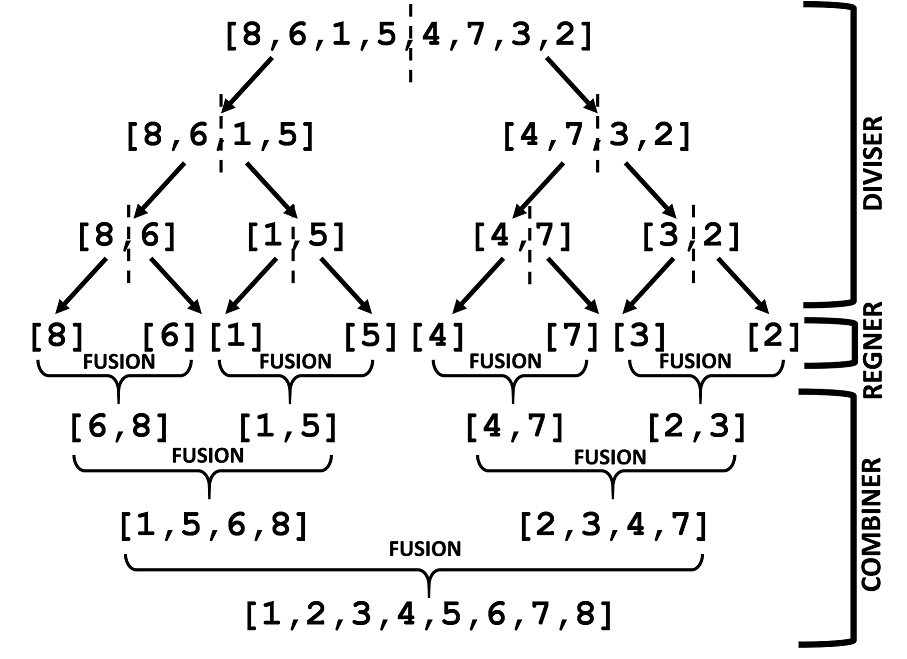 Soit une liste L de nombres à trier dans l’ordre croissant. Par exemple L = [8,6,1,5,4,7,3,2]. On va couper L en deux par le milieu. On obtient alors les deux listes suivantes : [8,6,1,5] et [4,7,3,2].