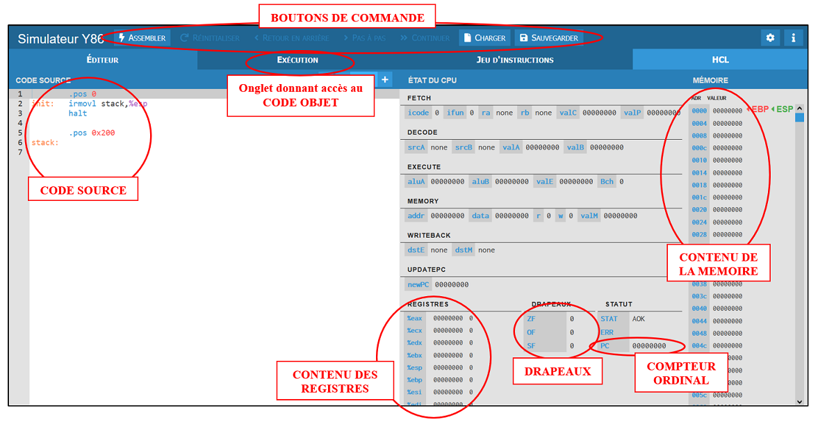 Pour programmer en y86, on utilise le simulateur en ligne : https://dept-info.labri.fr/ENSEIGNEMENT/archi/y86js_v2/index.html.