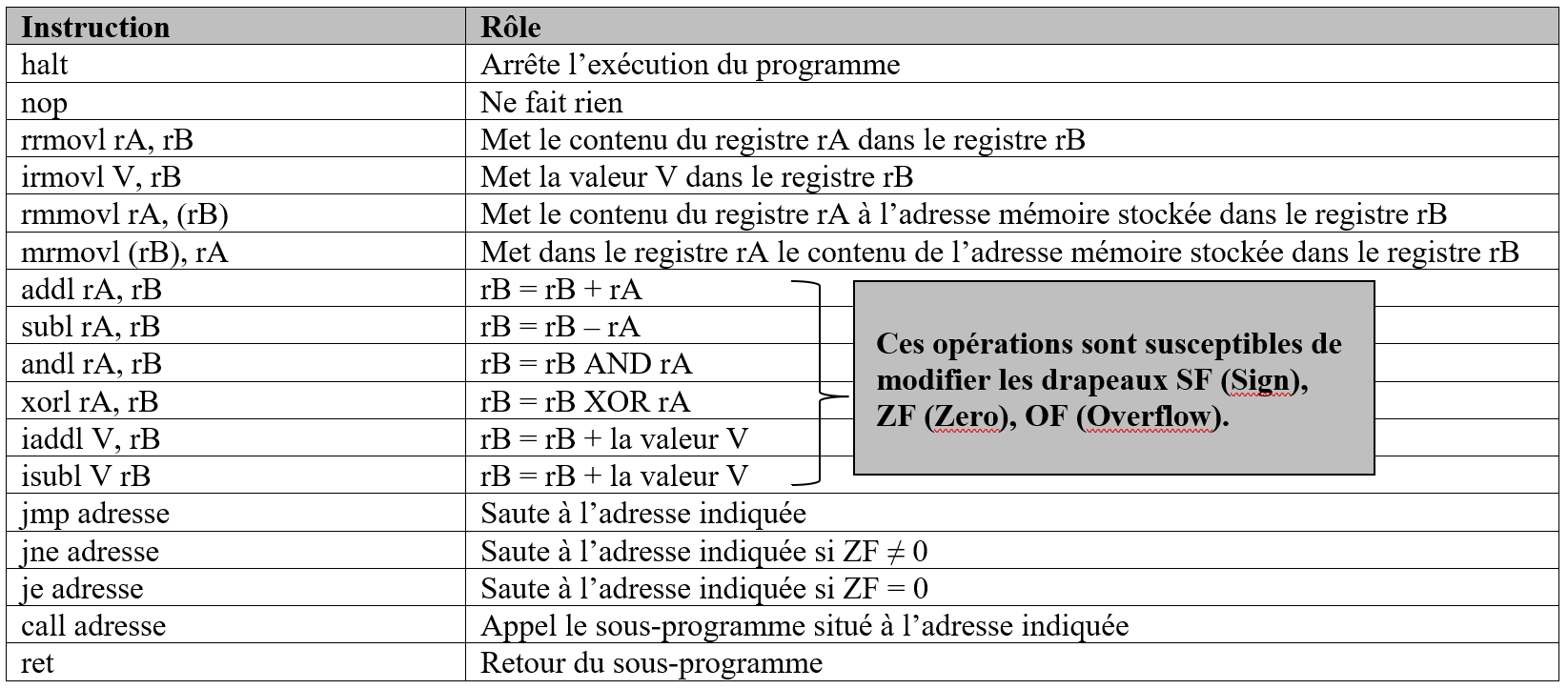 Le jeu d’instructions du y86 est très réduit. Les instructions occupent de 1 à 6 octets en mémoire.