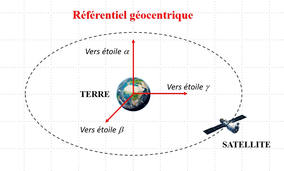 - Si la durée du phénomène est courte par rapport à un an, on peut négliger le fait que la Terre tourne autour du Soleil : on peut donc utiliser le référentiel géocentrique. L'origine du repère est au centre de la Terre, et les trois axes pointent vers des étoiles lointaines : on s'affranchit ainsi de la rotation de la Terre sur elle-même. Ce référentiel est adapté à l’étude du mouvement d’un satellite autour de la Terre, par exemple :