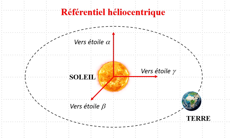 - Si la durée du phénomène étudié est plus longue ou si les distances considérées sont plus importantes, on utilise le référentiel héliocentrique. L'origine du repère est au centre de la Soleil (on s'affranchit ainsi du mouvement de révolution de la Terre autour du Soleil), et les trois axes pointent vers des étoiles lointaines. Ce référentiel est par exemple adapté à l’étude du mouvement d’un vaisseau interplanétaire. La durée de révolution du Soleil autour du centre galactique est évaluée à 226 millions d’années. On peut donc négliger ce mouvement pour n’importe quel phénomène à l’échelle humaine :