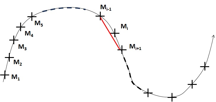 - \( M_{i-1}M_{i+1} \) : distance entre le point \( M_{i} \) et le point \( M_{i+1} \), exprimée en m (longueur du segment rouge sur le schéma précédent)